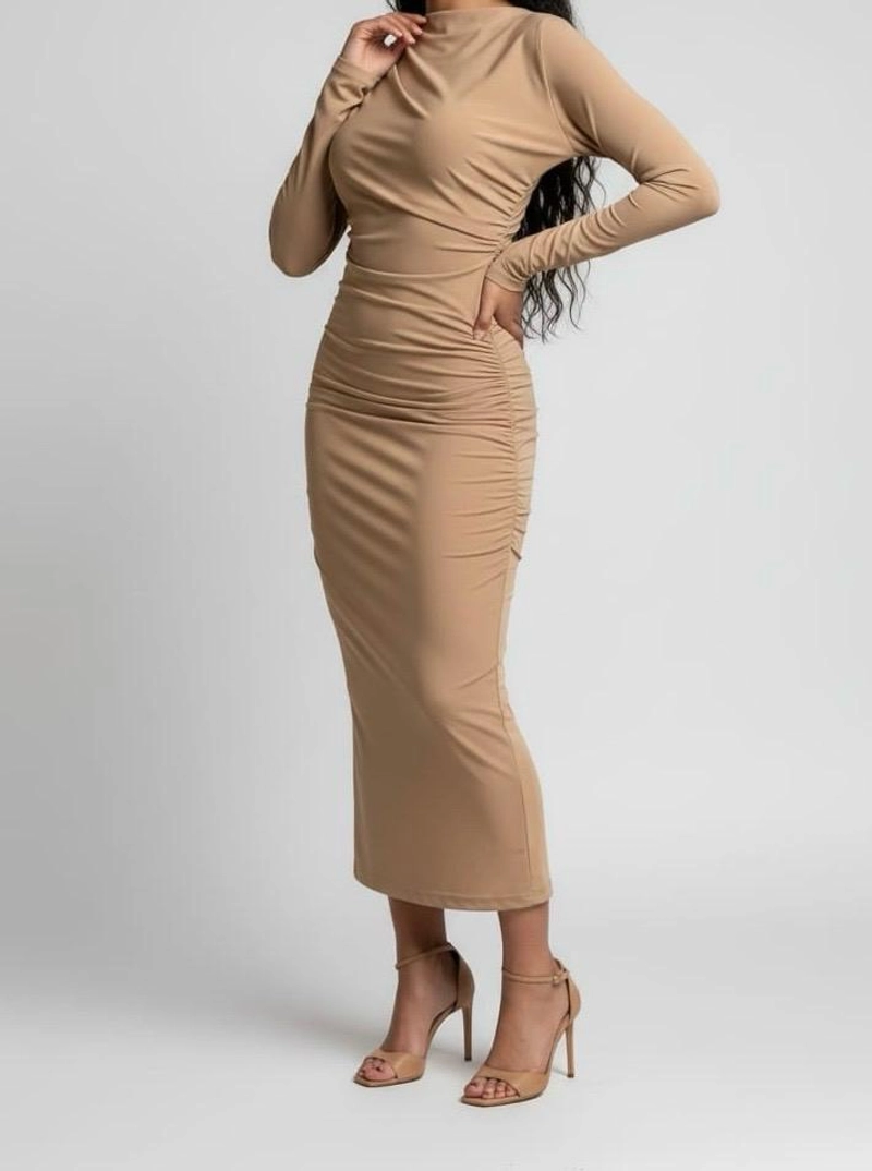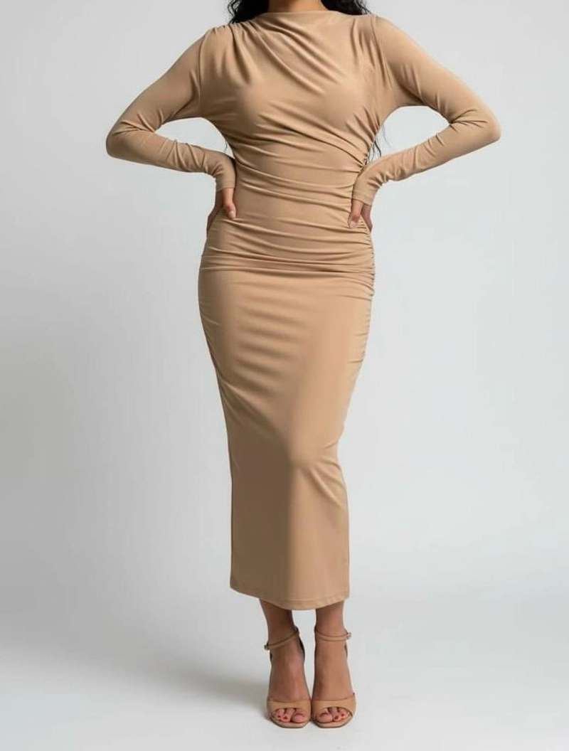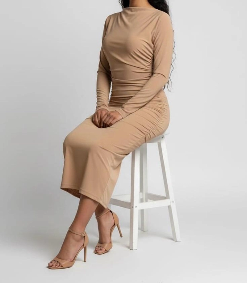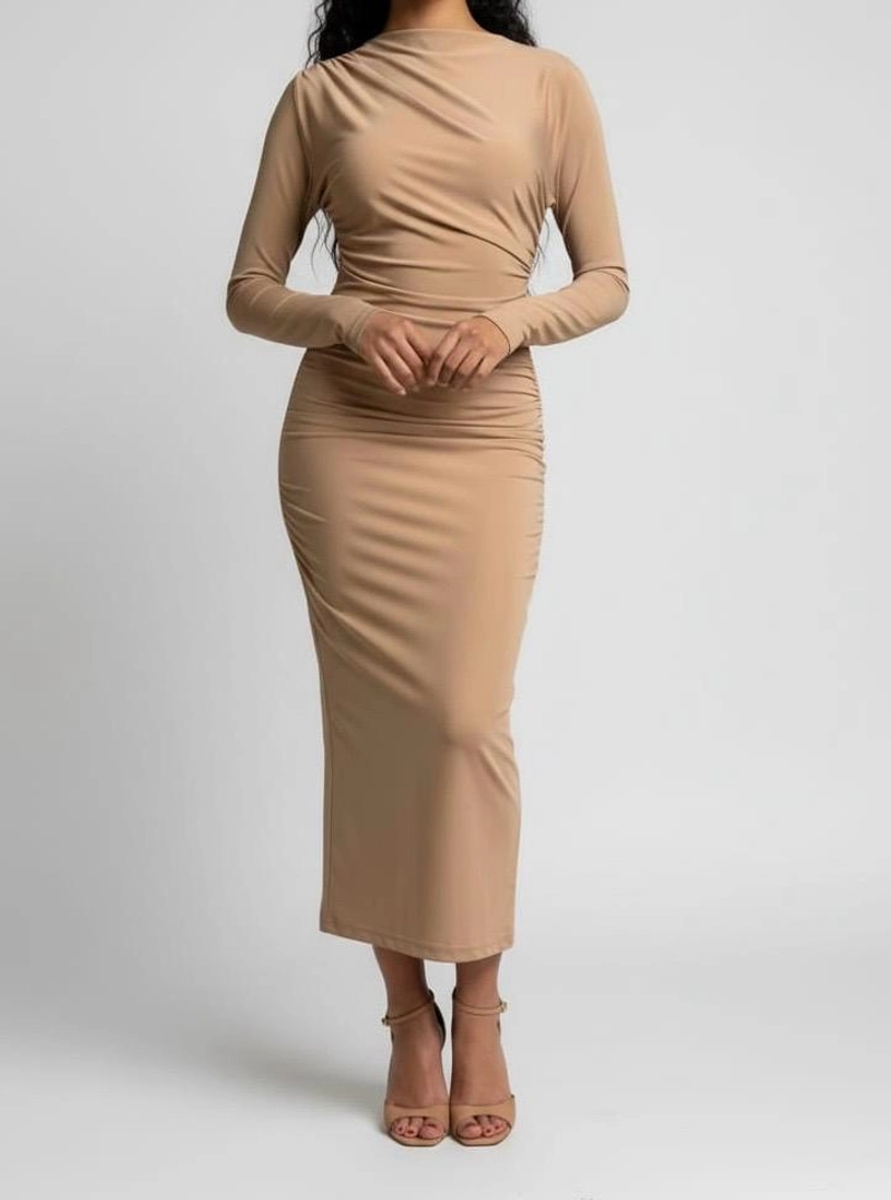 季节性 | 女士焦糖色垂坠中长连衣裙,高领,长袖,针织面料