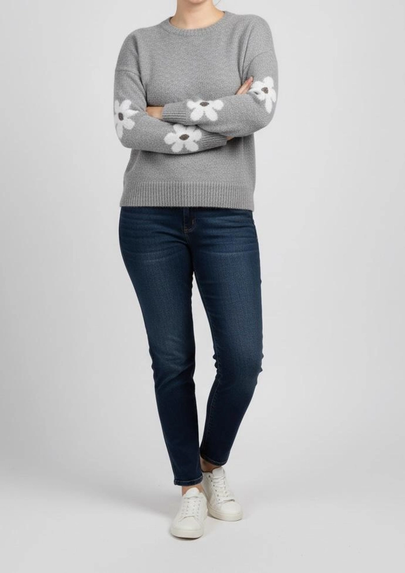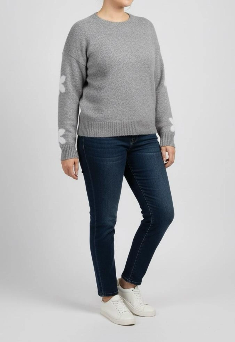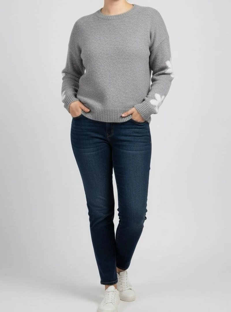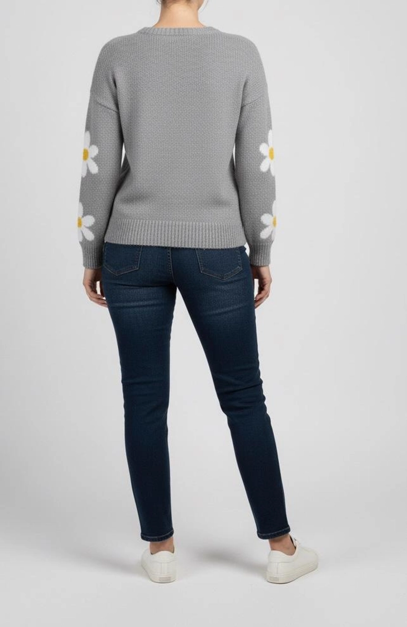 女士冬季针织毛衣,标准尺码-灰色,雏菊花朵图案,柔软。