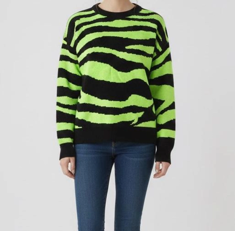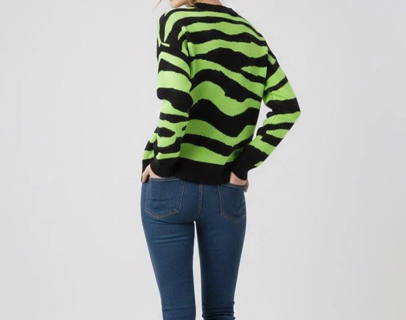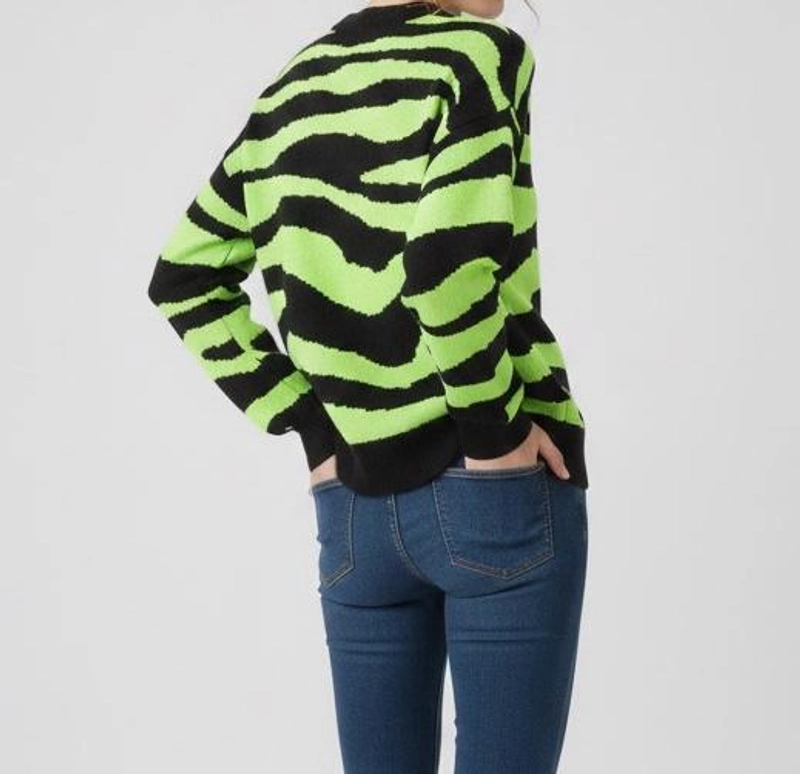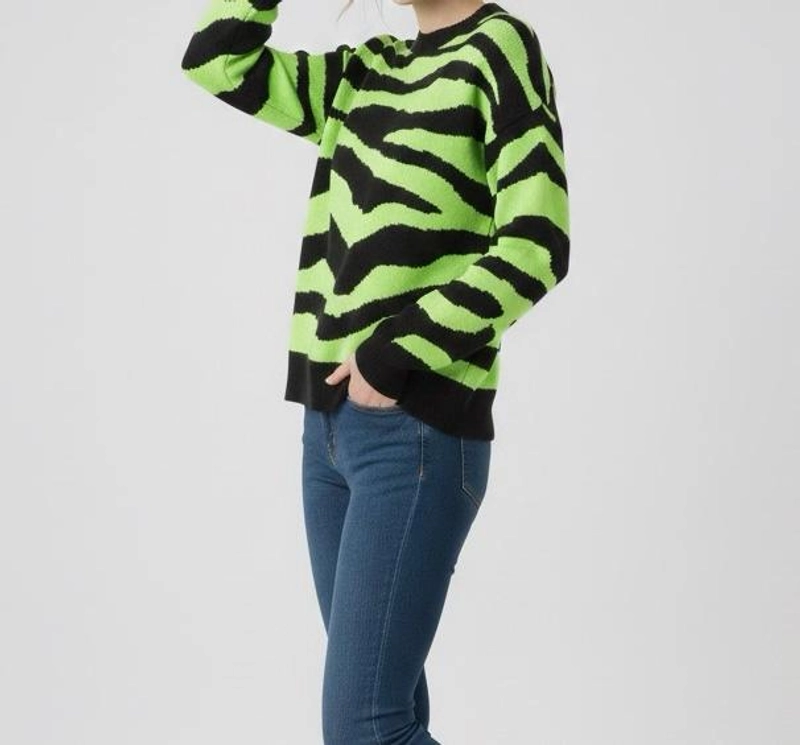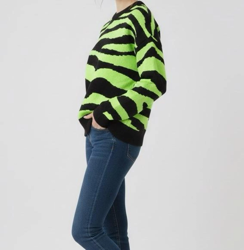 女士冬季霓虹绿色黑色斑马图案毛衣针织衫舒适宽松版型