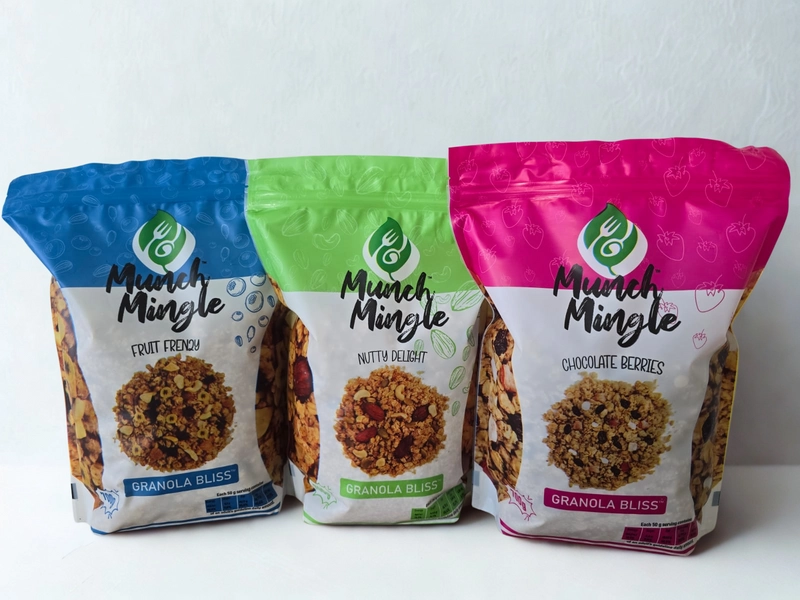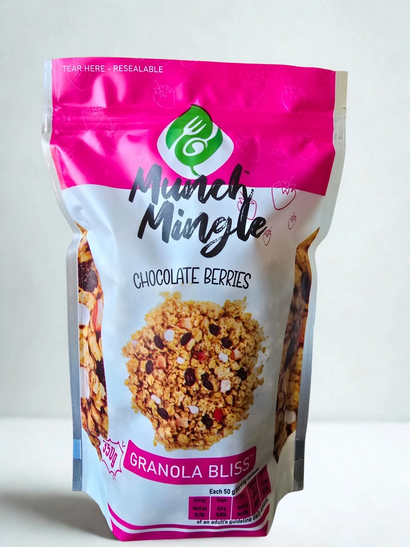 Munch Mingle Granola 混合了巧克力、浆果、疯狂水果、坚果味、松脆燕麦片和干果、坚果和巧克力