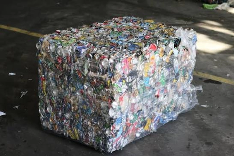 对打包后的白色和蓝色 PET 瓶进行了分类以供回收利用